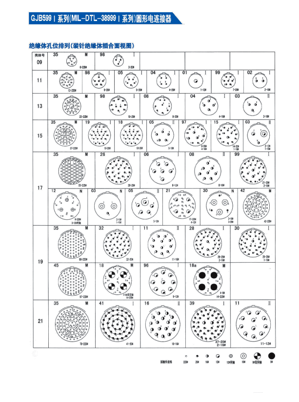 JY27467T15F35PN圓形電連接器,該產(chǎn)品符合GJB599A(MIL-DTL-38999K)系列要求,采用卡口式快速連接,接點(diǎn)密度高。15F35是產(chǎn)品排列芯譜,接觸件15芯,電流有大小,是怎么排列的?通過下面圖片就能了解。