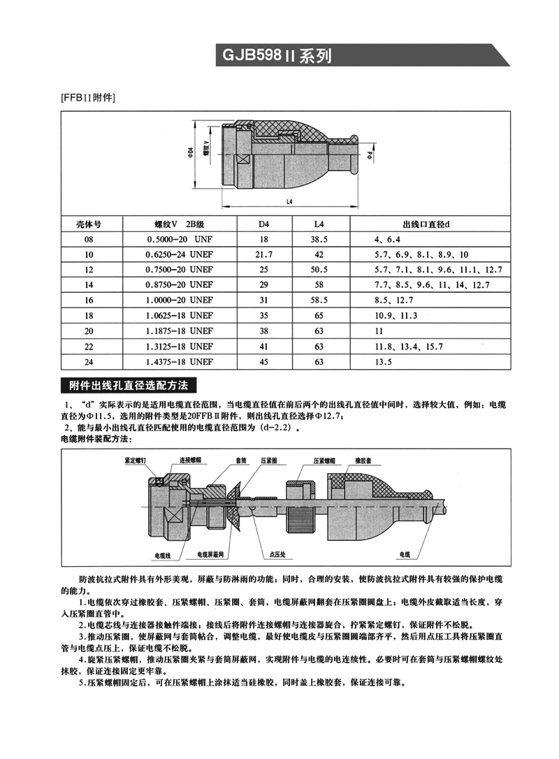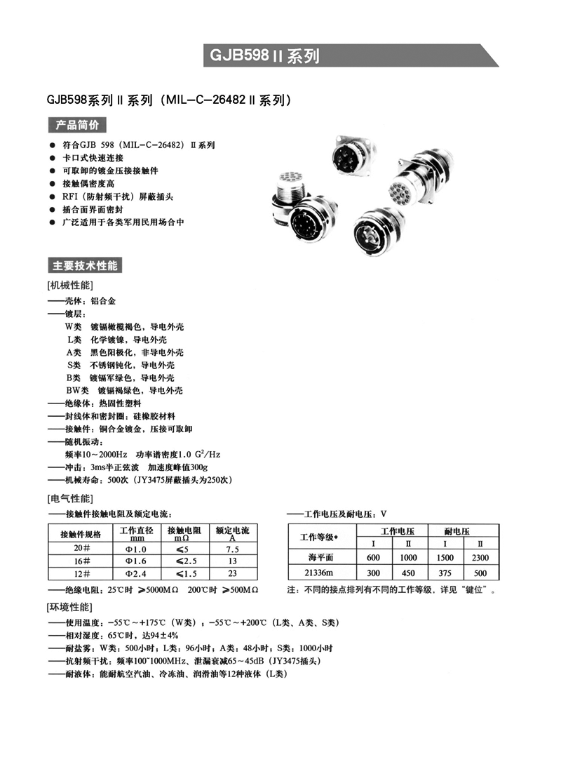 符合GJB598(MIL-C-26482)II系列,卡口式快速連接,可取卸壓接接觸件,RFI(防射頻干擾)屏蔽插頭,插合截面密封 。