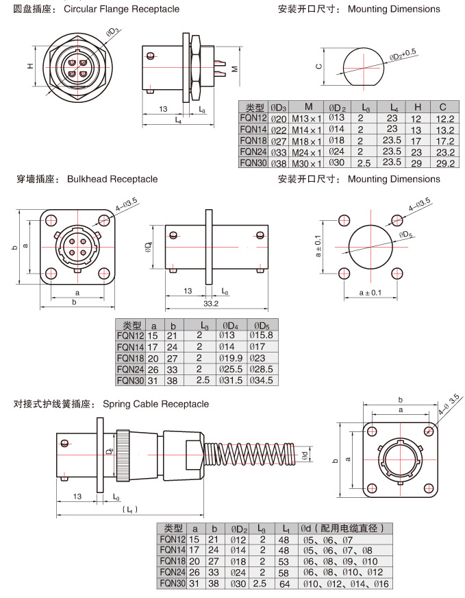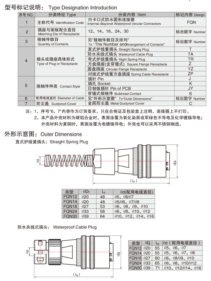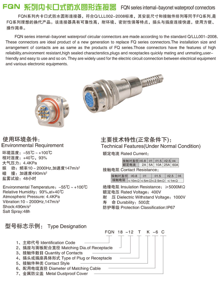 FQN系列內(nèi)卡口式防水型圓形電連接器,符合Q/LLL002-2008標(biāo)準(zhǔn),產(chǎn)品價格的安裝尺寸及接點型譜等同F(xiàn)Q和Q系列產(chǎn)品價格,是FQ系列產(chǎn)品價格的改進型。體積小,重量輕,內(nèi)卡口快速連接,零件由鋁棒或銅棒車加工制造(非鋁壓鑄件),耐環(huán)境,防水、防鹽霧、防霉菌,操作使用簡便。插針、插孔引線采用焊接式。產(chǎn)品價格被廣泛使用于各種電子儀器、電子、電氣設(shè)備間有防水要求的電連接中。產(chǎn)品價格符合按鐵道部標(biāo)準(zhǔn)TB/T2761。產(chǎn)品價格針、孔可以根據(jù)您的要求互換。