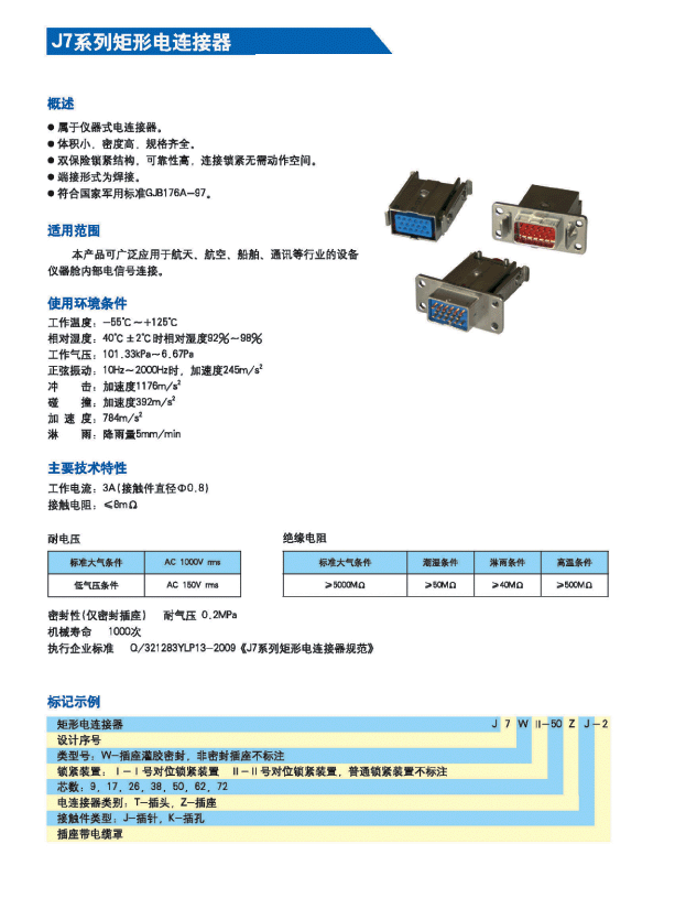 J7-72芯矩形航空接插件,適用于各種電子儀器、電氣設備系統(tǒng)之間的電路連接。該產(chǎn)品為 電子元器件制造廠生產(chǎn)線認證合格產(chǎn)品;認證采用的國家 標準為GJB 176-86《耐環(huán)境線簧孔矩形電連接器總規(guī)范》。連接方式為直插連接,使用方便,可快速插拔。帶有獨特的雙重鎖緊機構(gòu),防雨,外殼屏幕,插座灌膠密封。體積小,重量輕。插孔采用高可靠性能插孔,插拔力小,使用壽命長.
