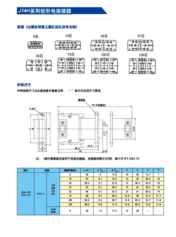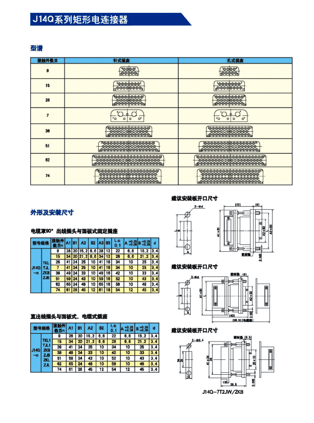 74芯矩形電連接器有好多系列,我公司有:J30J,J14A,J36A系列。請(qǐng)參照以下表格,根據(jù)自己的要求選用。