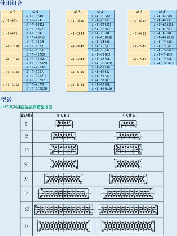 示例:J14T系列,接觸件數(shù)目為15、產(chǎn)品型別插座,接觸件型別插針,面板式安裝的電連接器標(biāo)識(shí)為:J14F-15ZJB.