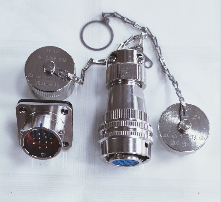 EXd隔爆型FB.Y50X-1412ZJ10-F/TKF對接式防爆連接器,前面是插座和插頭組合。FB.Y50X-1412ZJ10-F是移動式方法蘭插座,接觸件12芯,有4根接插件電流10A,另外8根5A電流,與防爆插頭采用卡口式連接,連接后防水密封,防粉末,火花的滲入,端接方式焊接,方便牢固,電流傳輸快。材料有鋁合金,銅、不銹鋼選擇,一般用于煤礦測井,油墨工廠等防爆的場所。